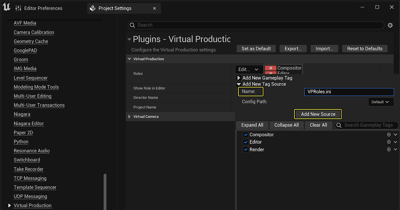 역할은 디폴트로DefaultGameplayTags.ini에 저장됩니다.프로젝트 세팅(Project Settings)에서 새.ini파일을 생성하여 새 역할을 만들 때소스(Source)파일로 사용할 수 있습니다.새 태그 소스 추가(Add New Tag Source)를 펼쳐서 파일 이름을 입력한 다음,새 소스 추가(Add New Source)버튼을 눌러 새 파일을 만듭니다.