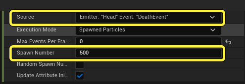 파티클 스폰 모듈 아래에서 소멸 이벤트 생성(Generate Death Event) 을 선택하고 Delete 키를 눌러 파티클 스폰 모듈에서 해당 프로퍼티를 삭제합니다.