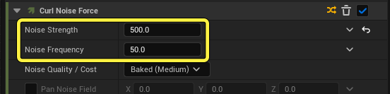 옆에 있는 더하기 모양의 아이콘을 클릭하고 드롭다운 메뉴에서 컬 노이즈 포스(Curl Noise Force) 를 선택합니다. 디테일 패널에서 컬 노이즈 포스 옵션이 열립니다. 노이즈 강도(Noise Strength) 값을 500 으로 변경합니다. 노이즈 주파수(Noise Frequency) 값을 50 으로 변경합니다. 컬 노이즈는 폭죽 파티클의 트레일에 진동 움직임을 추가합니다.
