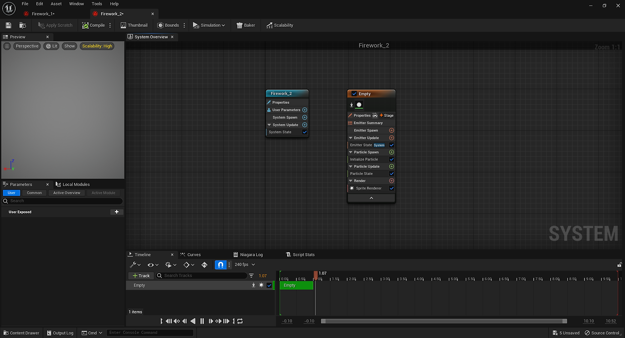 머티리얼이 준비된 후에는 폭죽을 구성하는 모든 모듈을 포함하는 이미터를 생성해 보겠습니다.