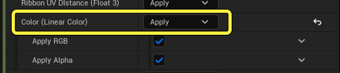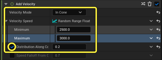 Change the Velocity settings. 컬러(선형 컬러)(Color(Linear Color)) 필드의 드롭다운 메뉴에서 적용 을 선택합니다. 이 이미터에서 스폰된 파티클의 컬러를 따르는 다른 이미터의 파티클 컬러로 설정합니다.