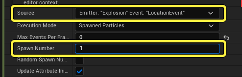 4. 첫 번째 폭죽 폭발 이펙트 제작하기 폭죽이 폭발할 때 보이는 모양을 모방한 파티클에 원형 셰이프를 추가하여 불꽃의 끝에서 화려한 폭발을 생성합니다. 첫 번째 빈 이미터 스택을 선택하고 우클릭합니다. 드롭다운 메뉴에서 복사(Copy) 를 선택합니다. 시스템 에디터 에서 우클릭하고 드롭다운 메뉴에서 붙여넣기(Paste) 를 선택합니다. 이미터 이름을 더블클릭하고 Explosion 으로 변경합니다. 파티클 스폰 이러한 세팅은 파티클이 스폰될 때 파티클이 어떻게 행동할지 결정합니다.