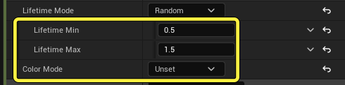 파티클 초기화(Initialize Particle) 를 선택하여 디테일(Details) 패널에서 파티클 초기화 세팅을 엽니다. 수명 최소 값을 0.5 로, 수명 최대 값을 1.5 로 변경합니다.