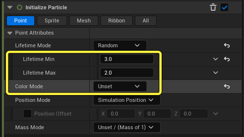 파티클 스폰 > 파티클 초기화(Initialize Particle) 를 선택하면 디테일 패널에서 파티클 초기화 모듈 세팅이 열립니다. 수명 모드(Lifetime Mode) 를 랜덤(Random) 으로 설정합니다. 이렇게 하면 파티클이 다양한 시간 동안 지속됩니다. 수명 최소(Lifetime Minimum) 값을 2.0 으로 변경합니다. 수명 최대(Lifetime Maximum) 값을 3.0 으로 변경합니다. 최소 값과 최대 값은 파티클 수명의 랜덤 값을 결정합니다.