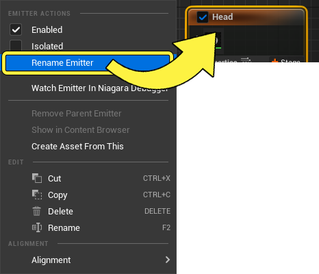 빈 이미터 템플릿이 포함된 시스템 에디터 가 열립니다. 이미지를 클릭하면 확대됩니다. 빈 이미터를 우클릭하고 드롭다운 메뉴에서 이름변경(Rename) 을 선택합니다. 빈 이미터의 이름을 Head 로 변경합니다. 이렇게 하면 폭죽의 다른 부분을 구분하는 데 도움이 됩니다. Rename the emitter Head