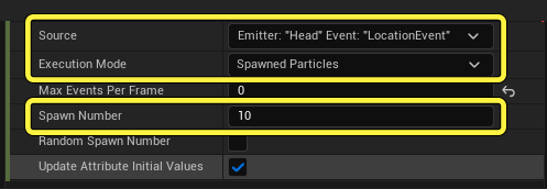 . 실행 모드(Execution Mode) 필드의 드롭다운 메뉴에서 스폰된 파티클(Spawned Particles) 을 선택합니다. 이것은 이벤트 처리의 결과로 파티클을 스폰할지 여부를 제어합니다. 스폰 수(Spawn Number) 를 10 으로 설정합니다. 이것은 헤드 파티클을 따르는 파티클의 수를 결정합니다. This refers to the empty emitter to spawn.