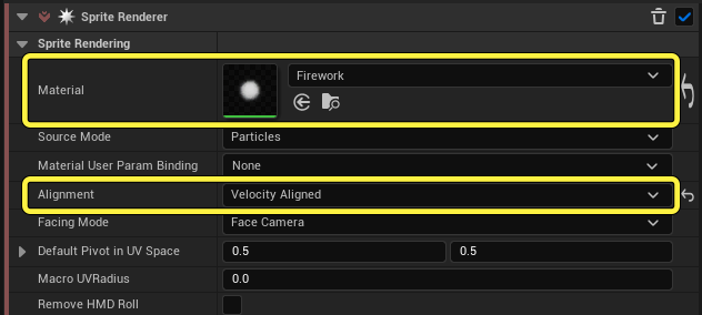 머티리얼(Material) 드롭다운 메뉴에서 생성한 Firework 머티리얼을 선택합니다. 정렬(Alignment) 을 속도 정렬(Velocity Aligned) 로 설정합니다. 속도 정렬은 파티클이 속도 벡터의 방향을 향하도록 회전합니다.
