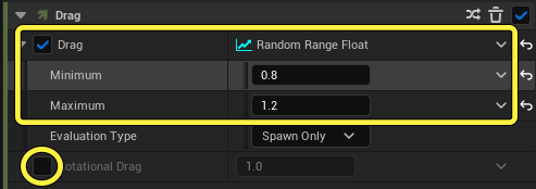이렇게 하면 폭죽이 하늘로 올라가는 것처럼 파티클이 더 천천히 공중으로 올라갑니다. 회전 드래그(Rotational Drag) 를 비활성화합니다.