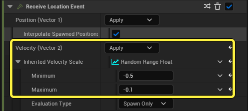 이벤트 핸들러 모듈 옆에 있는 더하기 모양의 아이콘을 클릭하고 드롭다운 메뉴에서 위치 이벤트 수신(Receive Location Event) 을 선택합니다. 위치 이벤트 수신 세팅이 디테일 패널에서 자동으로 열립니다. 속도(벡터2)(Velocity(Vector2)) 필드의 드롭다운 메뉴에서 적용(Apply) 을 선택합니다. 이것은 헤드 빈 이미터의 위치를 따릅니다. 상속된 속도 스케일(Inherited VelocityScale) 옆에 있는 아래쪽 화살표를 클릭하고 드롭다운 메뉴에서 랜덤 범위 플로트(Random Range Float) 를 선택합니다. 최소(Minimum) 값을 -0.5 로 설정합니다. 최대(Maximum) 값을 -0.1 로 설정합니다. 음수 값은 폭죽을 반대 방향으로 확장합니다.