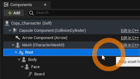 컴포넌트 패널의 Root를 끌어 Mesh의 자식으로 만들고