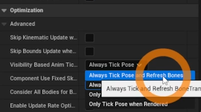 메시를 선택해서 디테일에서 아래로 쭉내려서 Visibility Based Anim Tick이 Always Tick Pose and Refresh bones로 변경한다. 매니를 비저블 언체크를 했기 때문이다.