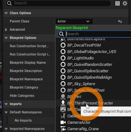 Parent를 BP_ThirdPersonCharacte를 선택하다.