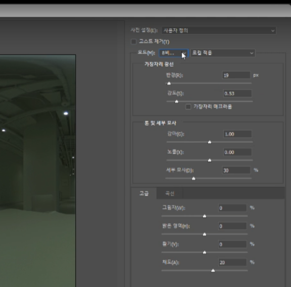 반경은 로컬 밝기 영역의 크기를 지정합니다. 강도는 픽셀이 같은 명도 영역으로 인식되지 않는 데 필요한 픽셀 사이의 색조 값 차이를 지정합니다.