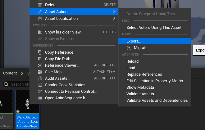 애니메이션 시퀀스 위를 우클릭하고 Export하면 FBX로 익스포트할수 있다.