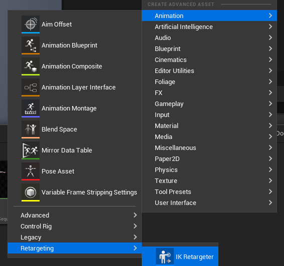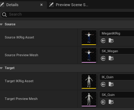 이제 컨텐츠 브라우저에 우클릭후 IK Retargeter를 만들자. 에디터가 열리면 애니메이션 원본이 있는 리그와 복제해줄 타겟을 선택한다. Preview Mesh는 자동으로 선택된다.