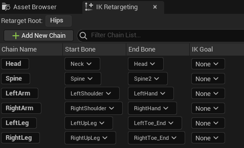 IK 리그 에디터가 열리면 왼쪽의 본트리에서 헤드 스파인, 왼팔 오른팔 왼다리 오른다리를 구간을 골라가면 Add New Chain 해준다. Chain Name은 Control Rig와 호환성언리얼과 같이 해주는게 좋지만 일단은 자동으로 잡히는 이름으로 하자.