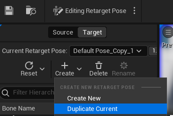 우상 Target 모드 상태에서 + Create를 누르고 Duplicate Current를 선택하고 포즈를 하나 만들자. 리타게팅 실퍠시 디폴트로 돌아갈수도 있다. Current Retarge Pose가 바뀐다.
