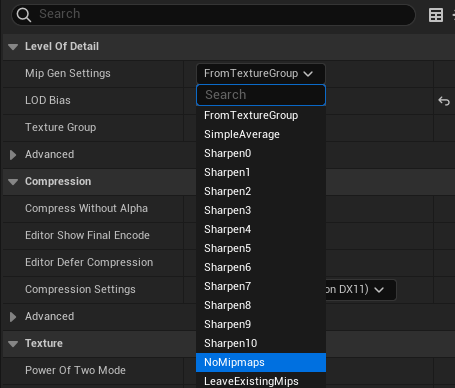 텍스쳐를 열어보면 레벨오브 디테일 밉생성세팅이 있다.
