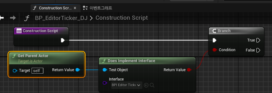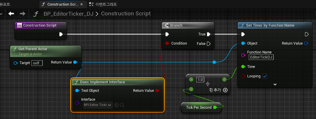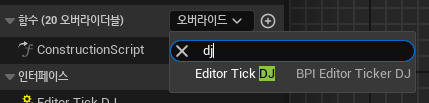 BPI가 있는지 체크하고 부모액터를 찾아서 BPI내 함수 Editor TickDJ를 타이머를 이용해 60프레임씩 호출한다. 아직 BPI함수는 구현을 안했다. 컨스트럭션 스크립이기 때문에 타이머를 사용했다.