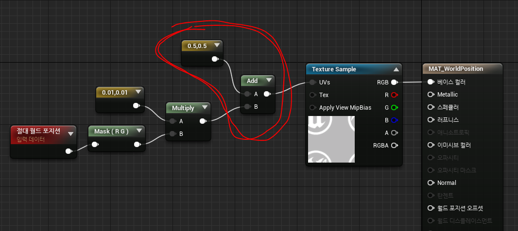 큐브의 position이 (5,5,5)였다면, World Position 노드는 (5,5,5)~(105,105,105)를 반환했을 것이다.