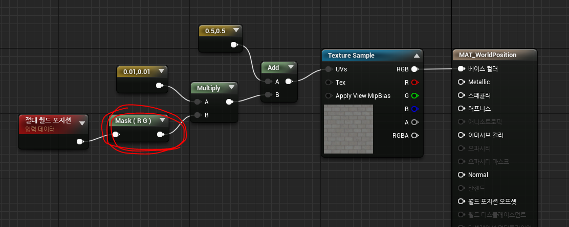 UV는 x,y 값을 가지므로, Mask 노드를 이용하여 x,y 값만 분리한다.