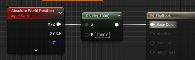 카메라의 월드 좌표를 출력한다. 언리얼의 색은 0~1사이 값이므로 1000으로 나누어주면 카메라 우직임에 따른 색의 변화를 알수 있다.