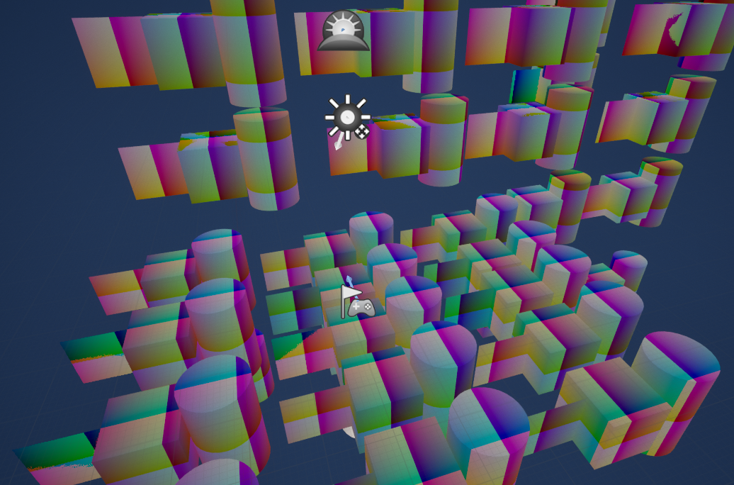액터를 많이 배치하고 좌표값을 1000으로 나누면 -500~500사이 공간에 값에 따라 색이 변화한다.