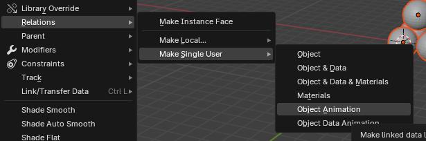 각각의 애니메이션으로 만들기 위해서 Make Single User > Object Animation을 한다.