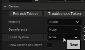 Cesium3DTileset0의 디테일을 보면 Credit System 이 None인데 이걸 구글 맵에 가서 설정해야하는듯