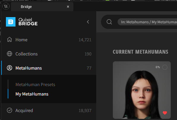 완성되면 로그아웃하고 언리얼에서 퀵셀브리지를 실행시킨후 MyMetahumans에서 다운한다.