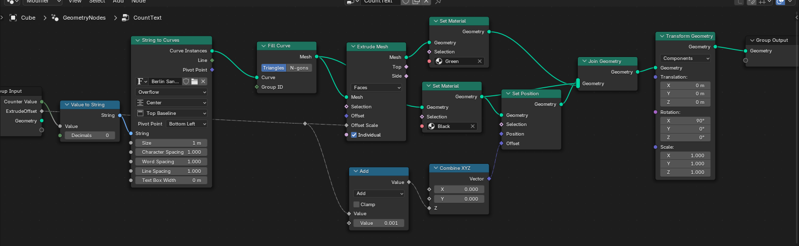 노드를 보면 CounterValue는 타입이 Int이므로 String으로 변경후 StringToCurves노드로 넣어준다. 이제 FillCurve로 면을 채워주고, ExtrudeMesh해준다 이때 뒷면은 비어 있게 되는데 이건 FillCurve로 나중에 매꿔준다.