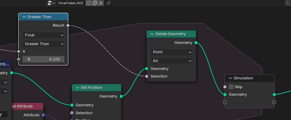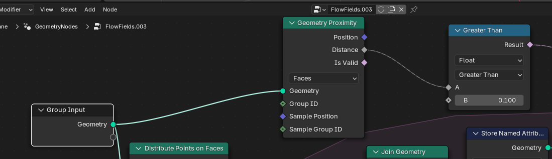 플레이하면 점들이 원래 영역밖으로 나가는걸 막기위해 GeometryProximity를 추가 Distance를 Compare를 추가 GreaterThan으로 설정 0,1로 한후 Result를