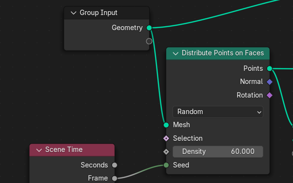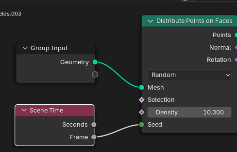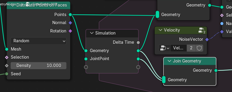 그런데 플레이 해보면 어느시점부터 움직임이 없다. DistributePoint의 시드가 고정되서 그런데 SceneTime을 연결해주고 아까 그룹한 velocity안의 NoiseTexture의 Scale->0, Detail을 0으로 변경해주자