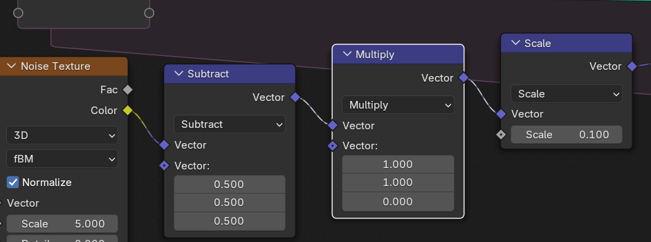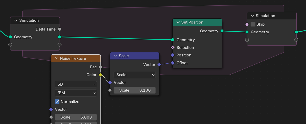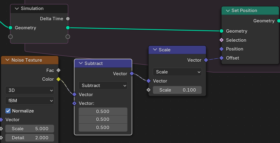 NoiseTexture는 현재 0~1의 값이 출력되므로 0.5를 빼주면 점들은 제자리에서 움직이게 된다. Noise의 Normalize를 꺼줘도비슷한것 같다.