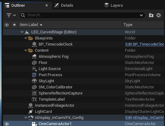 아웃라이너를 보면 SphereReflectionCapture, LightCard, nDisply_InCamVFX_Config등이 보인다