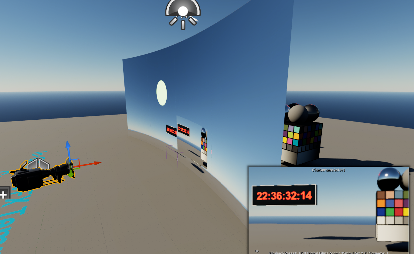 일단 씨뷰를 보면 왼쪽부터 씨네카메라 하나, 중간에 커브드 스크린(이게 nDisplay), 그 뒷쪽에 배경에셋이다.