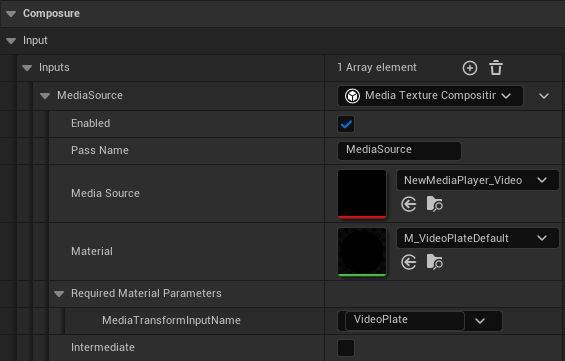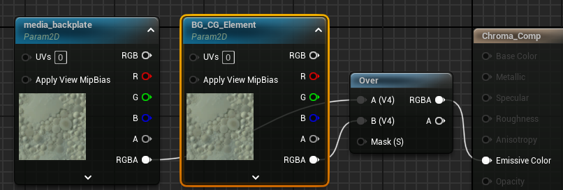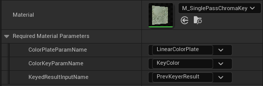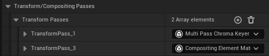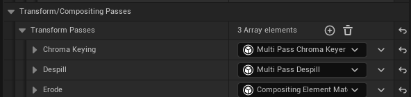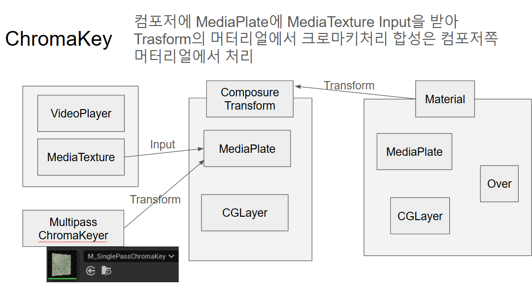 언리얼의 크로마키잉은 미디어플레이트에서 일어난다. 입력은 미디어플레이어에서 VideoPlayer의MediaTexture를 통해 입력 받아 미디어백플레이트의 Transform 크로마키어의 머터리얼을 통해 처리한다. 이렇게 만든 포그라운드레이어를 컴포저의 머터리얼을 통해 합성한다. 컴포저의 크로마키어 2개의 머터리얼이 필요하다.