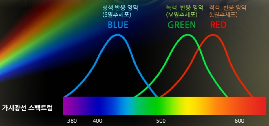L cone은 빨간색(R)을 M cone은 초록색(G)을 S cone은 파란색(B)을 인식합니다.