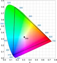 1996년 11월에 마이크로소프트와 휴렛팩커드가 주도한 색 영역. NTSC 72%는 sRGB 100%와 동일하며, sRGB 색 영역을 넘어서는 컬러를 재현할 수 있을 때 진정한 의미의 광색역 재현이라고 할 수 있다. 1990년 발표한 HDTV표준인 Rec.709와 동일하다. sRGB 색 영역[5]