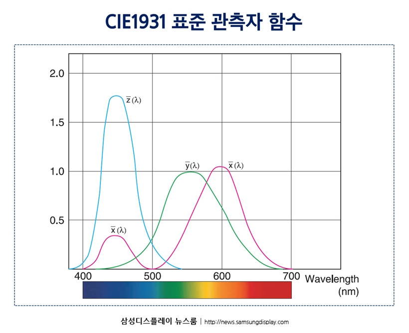CIE는 색을 계량화 하고 적절한 배합을 실현하기 위한 방법으로 빛의 삼원색 이론에 기반해, 가시광선 스펙트럼 영역에서 파랑(435.8nm), 초록(546.1nm), 빨강(700nm)을 두고 10nm마다 기준색을 설정 한 후 표준 관측자로 하여금 기준색과 동일한지 여부를 묻는 실험을 했습니다. 10nm 파장마다 나뉜 기준색을 놓고, 실험자는 파랑, 초록, 빨강의 단색광(원색)의 강도를 조절해 색을 조합, 기준색과 조합된 색이 같은 색으로 느껴지는지 확인해 나가는 방식입니다. 이런 방식으로 삼원색의 적절한 조합으로 모든 가시광선 영역의 색을 구현할 수 있는 기준을 마련했습니다. 이것을 '삼자극치' 값이라고 하며, 이 실험 결과를 토대로, 수학적인 과정을 거쳐 아래와 같은 1931 표준 관측자 함수가 만들어집니다.