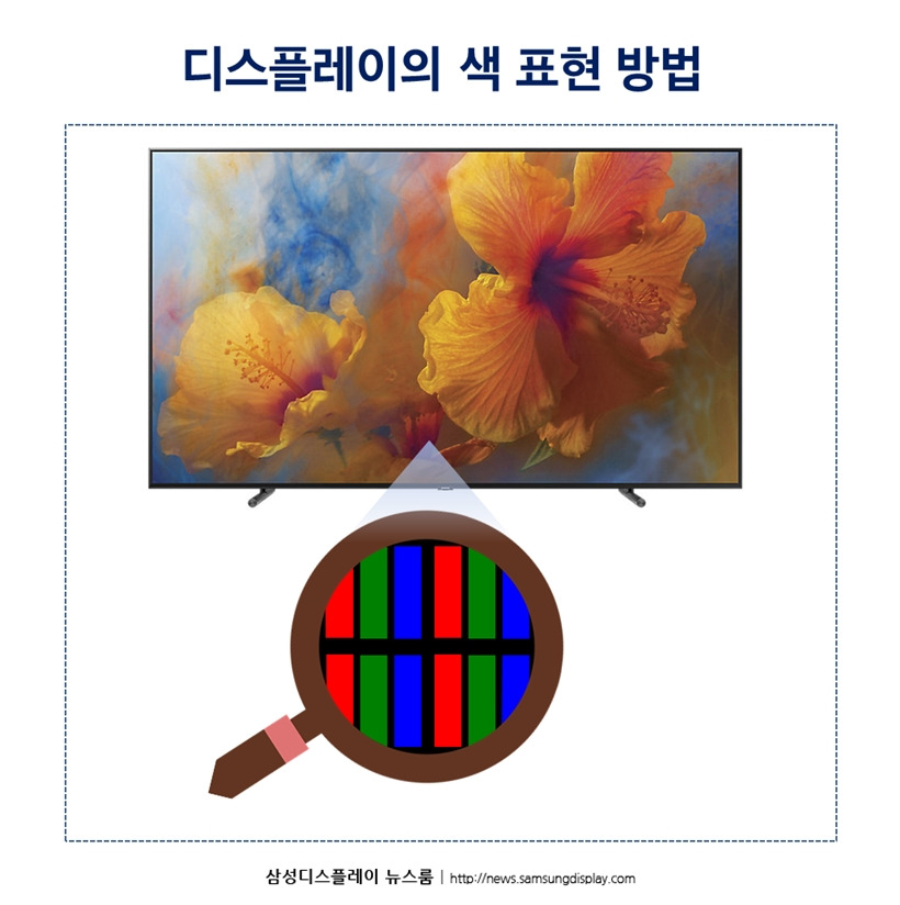 이런 색 조합의 원리를 디스플레이에서는 아래와 같이 구현합니다. TV나 스마트폰에 돋보기를 올려 놓고 보면 화면을 구성하는 픽셀 단위마다 일반적으로 3원색의 서브픽셀(sub-pixel)이 자리잡고 있음을 알 수 있습니다. 각 서브픽셀로 가산혼합을 이용해 최종적인 색을 구현하고, 우리 눈은 그 색을 인지하는 것이죠.