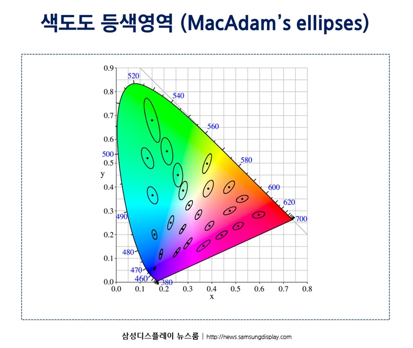 CIE는 CIE 1976을 발표하면서 시각적으로 조금 더 구별이 쉬운 색공간을 제안했습니다. 색도도 측면에서 본다면 기존의 CIE 1931이 초록색 영역이 지나치가 넓고, 실제 각각의 색과의 거리(차이)가 색도도 상에서는 왜곡이 큰 경우가 많아 개선이 필요했습니다. 아래 그림에서 타원형들은 사람이 그 타원 안의 색은 같은 색으로 느끼는 영역을 의미합니다. '등색 영역'이라고 하는데, 초록색으로 갈수록 그 크기가 파란색에 비해 무려 10배가 차이나기도 합니다.
