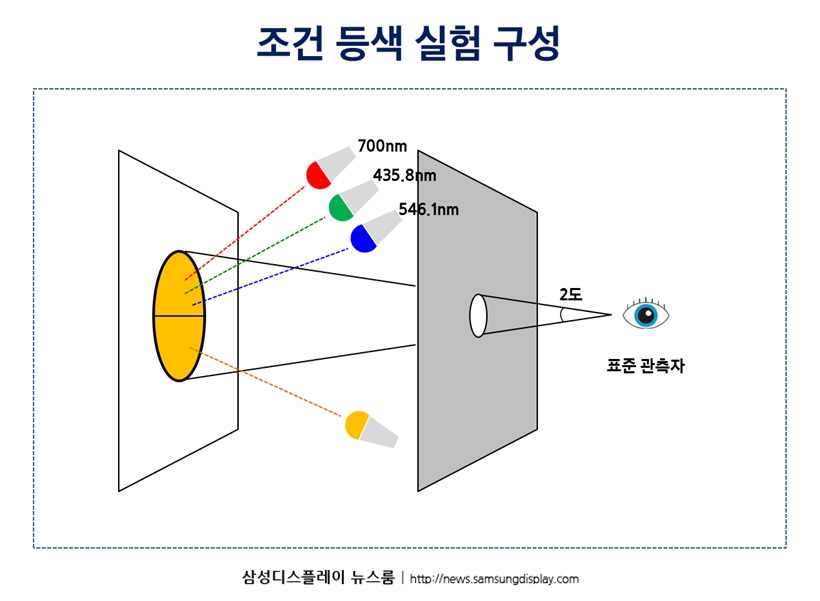 CIE는 이러한 실험 환경을 갖춰놓고 '조건 등색' 실험을 합니다. '조건 등색'이란 두 색채 자극에 대해 시세포가 동일하게 반응을 하는 한, 우리가 두 색을 동일하게 간주하는 현상을 말합니다. 예를 들면, 똑같은 바나나를 맑은 날 야외에서 눈으로 볼 때와, 스마트폰 화면 속의 사진으로 볼 때에 그 색은 극명하게 다르게 측정됩니다. 즉, 서로 다른 빛의 파장을 갖지만 인간은 같은 색으로 인지한다는 현상입니다.