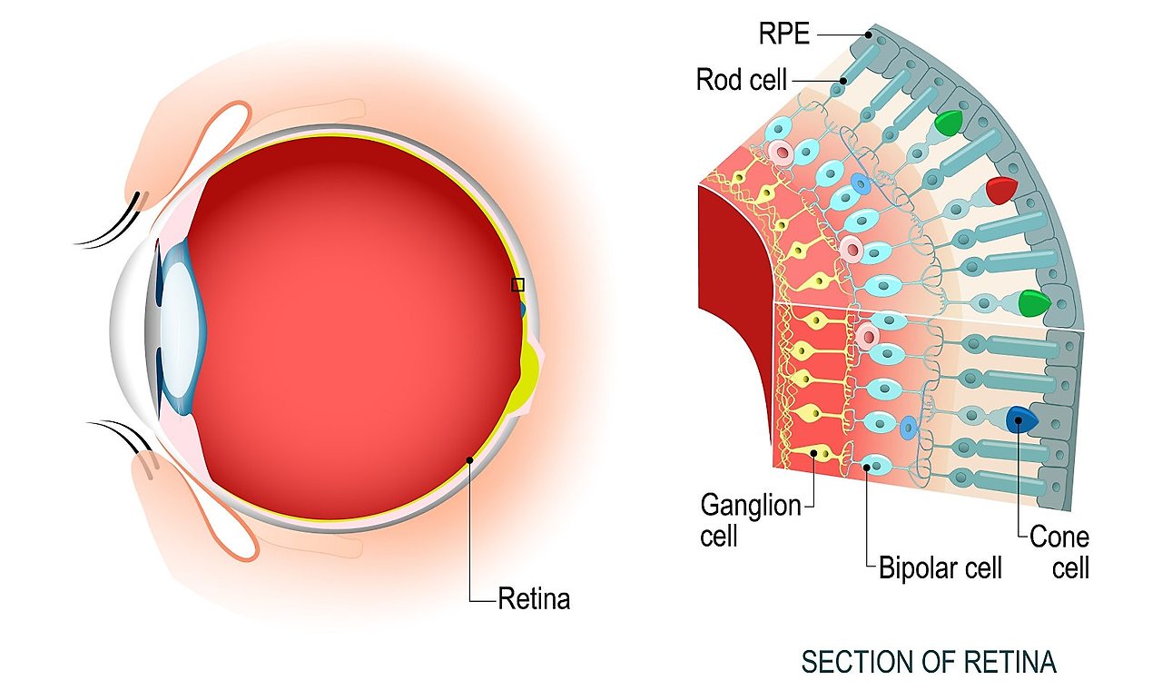추상체(Cone cell)는 색을 식별하며 중심와(fovea) 주변에 많이 분포해 있고, 간상체(Rod cell)는 명암을 식별하며 골고루 분포해 있어요.