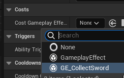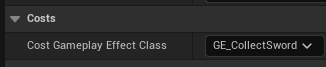 마지막으로 Class Defaults의 Costs Gameplay Effect에 GE_CollectSword를 지정