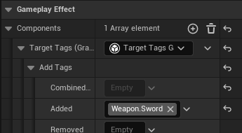 이펙터도 만들어야 하는데 우클릭 Actor를 만들고 클래스를 GameplayEffect를 선택 이름을 GE_CollectSword로 선택 오른쪽 디테일에서 Target Tag Gameplay Effec Component선택후 Tag 설정