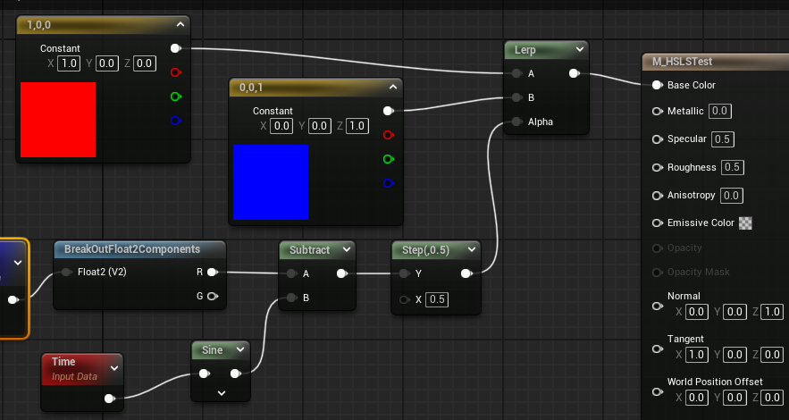 만든 HLSL을 노드대신 연결해주면 똑같이 움직인다. 움직임이 둔해서 sin(3*t)로 주기를 빠르게 해주었다.