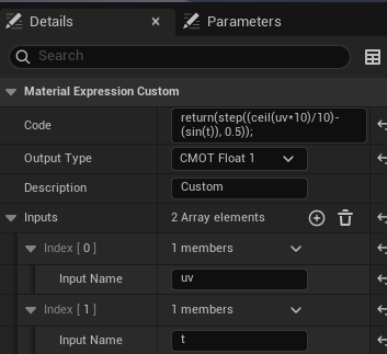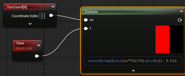 디테일에서 코드를 입력하고 Output Type을 Float1 Inputs을 추가해서 uv와 t를 추가해주자 그럼 노드에 입력이 생기는데 위와 같이 TexCoord와 Time을 연결해주면 된다.