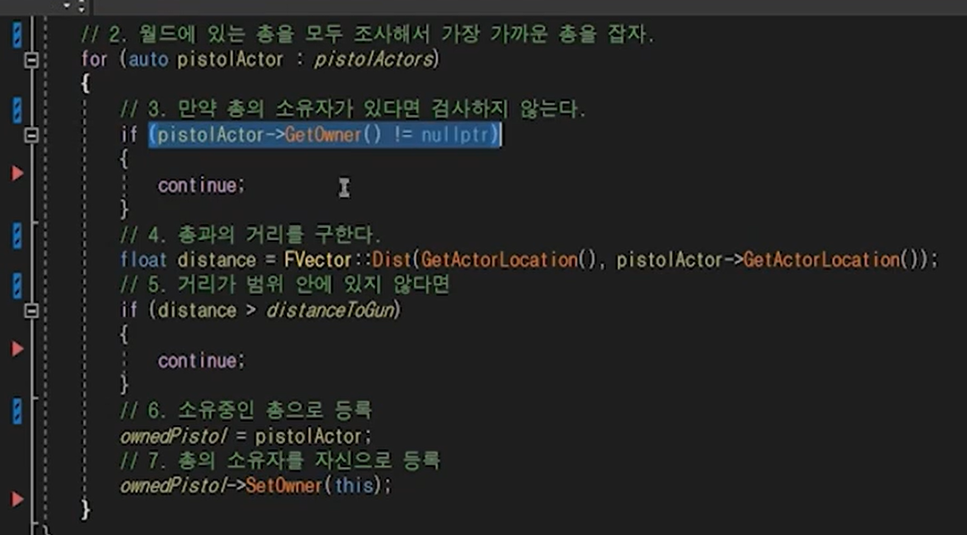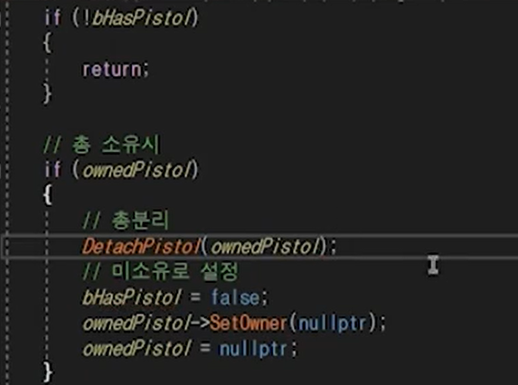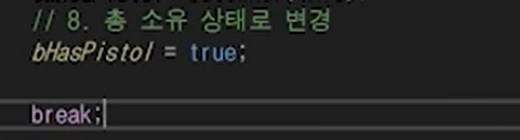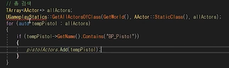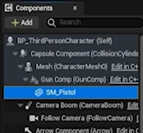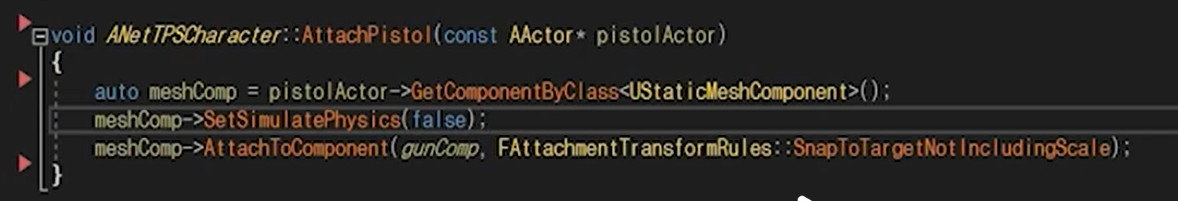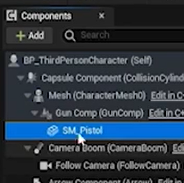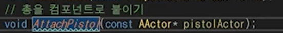 c에서 구현해준다. 찾은 pistolActor에서 스태틱메시컴포넌트의 피직스를 끄고 TPS의 gumComp에 붙여준다