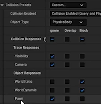 플레이어가 잡았을때 튀겨나가지 않게하기 위해 콜리젼프리셋을 Custom으로 바꾸고 다음과 같이 체크 Pawn을 꼭 디저블 한다.